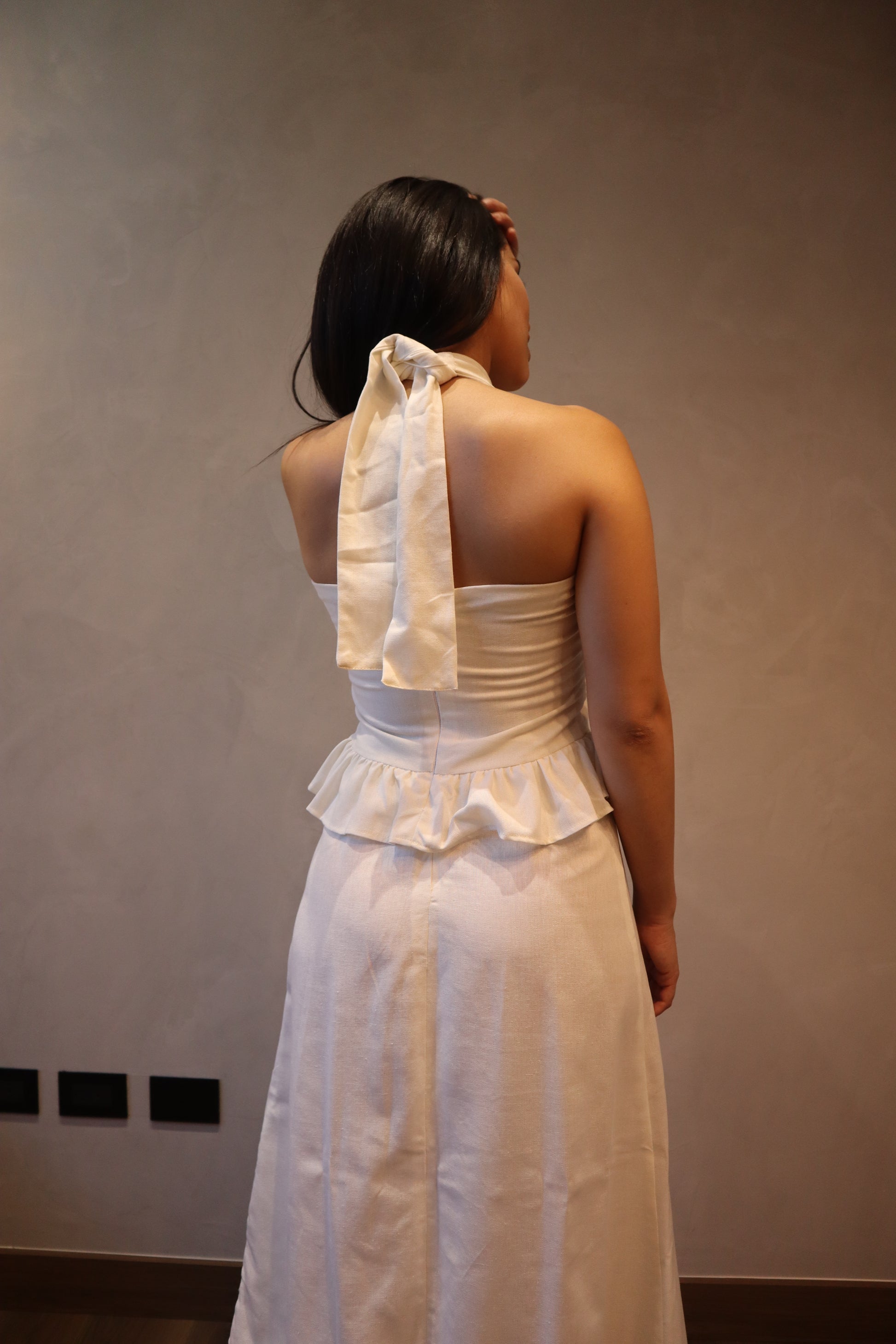 La Bianca Top con diseño halter cruzado y escote alto evoca frescura, elegancia y una feminidad sutil. Drapeado frontal que estiliza la figura y corte ajustado en la cintura.