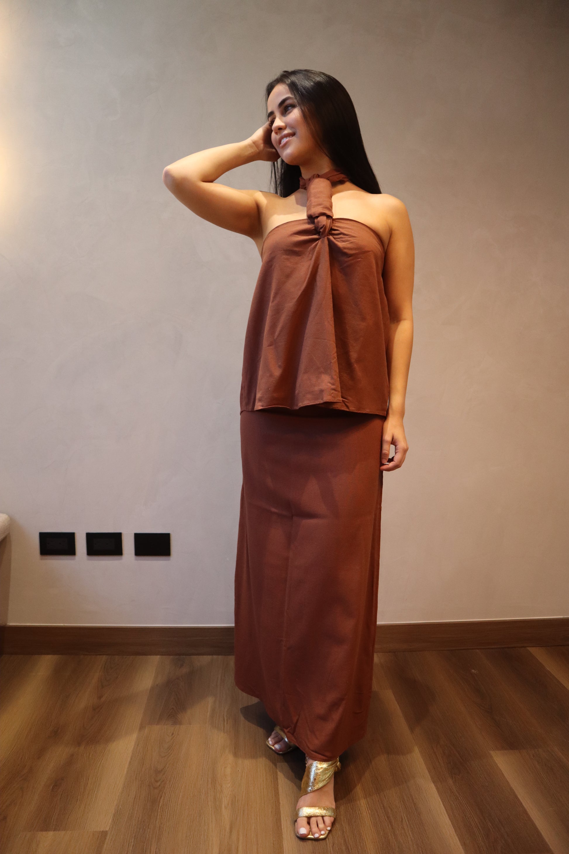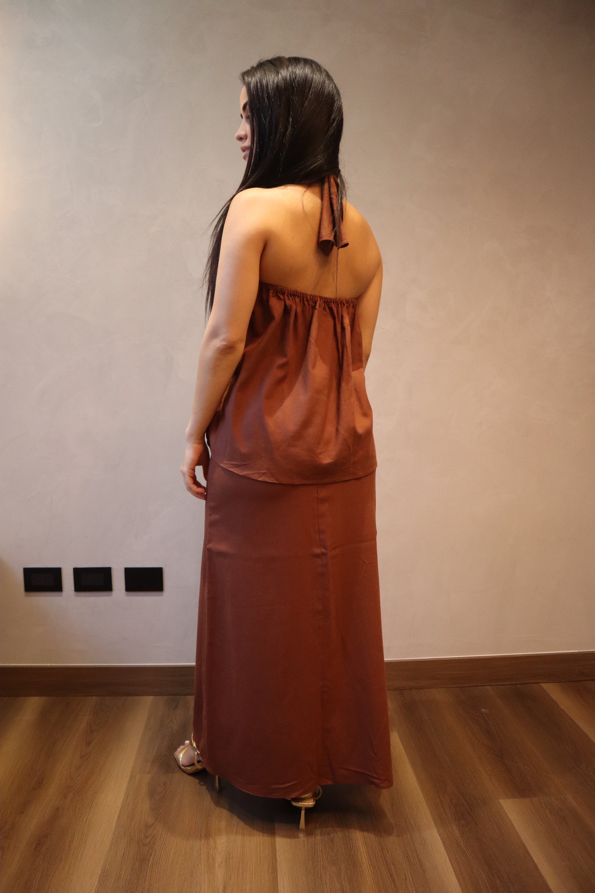 El Siena Top es una pieza que combina la frescura del lino con la elegancia del marrón chocolate. Su delicado moño al frente le da un aire romántico y femenino, mientras su silueta sencilla y versátil la convierte en el aliado perfecto para cualquier ocasión.