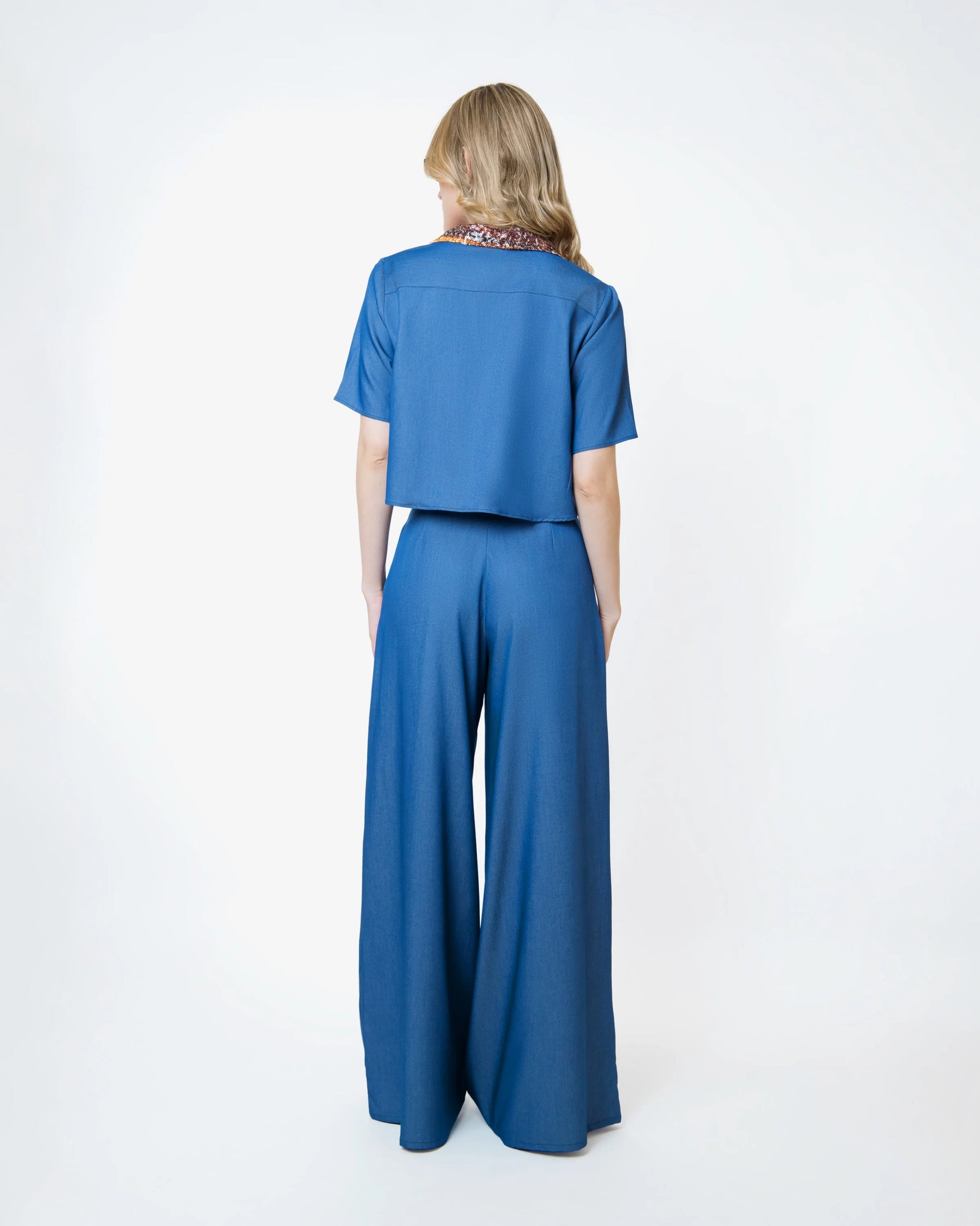 El pantalón complementa el set con una silueta de tiro alto y pierna extra ancha. Su diseño de inspiración sartorial incorpora pinzas frontales que estructuran la pieza, mientras la caída fluida del tejido alarga la silueta y aporta movimiento elegante al caminar. La pretina es limpia, con cierre frontal discreto y pasadores sutiles.